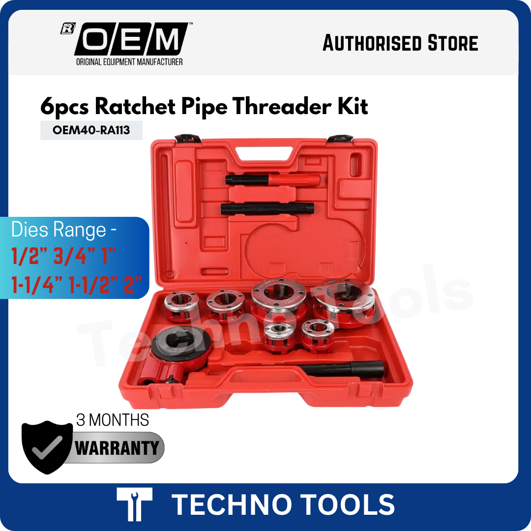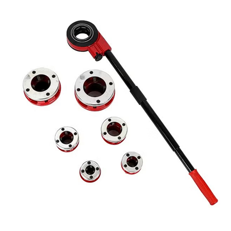 The 6-piece ratchet pipe threader kit is an essential toolset for professionals and DIY enthusiasts involved in plumbing and various piping installations. This versatile kit includes six interchangeable dies in sizes 1/2, 3/4, 1, 1 ¼, 1 - 1/2, and 2 inches, enabling users to thread pipes of different diameters. The ratchet threader assembly features a ratcheting mechanism that ensures smooth, efficient threading. This design allows for quick and precise operation without continuous repositioning, minimizing operator fatigue and boosting productivity.