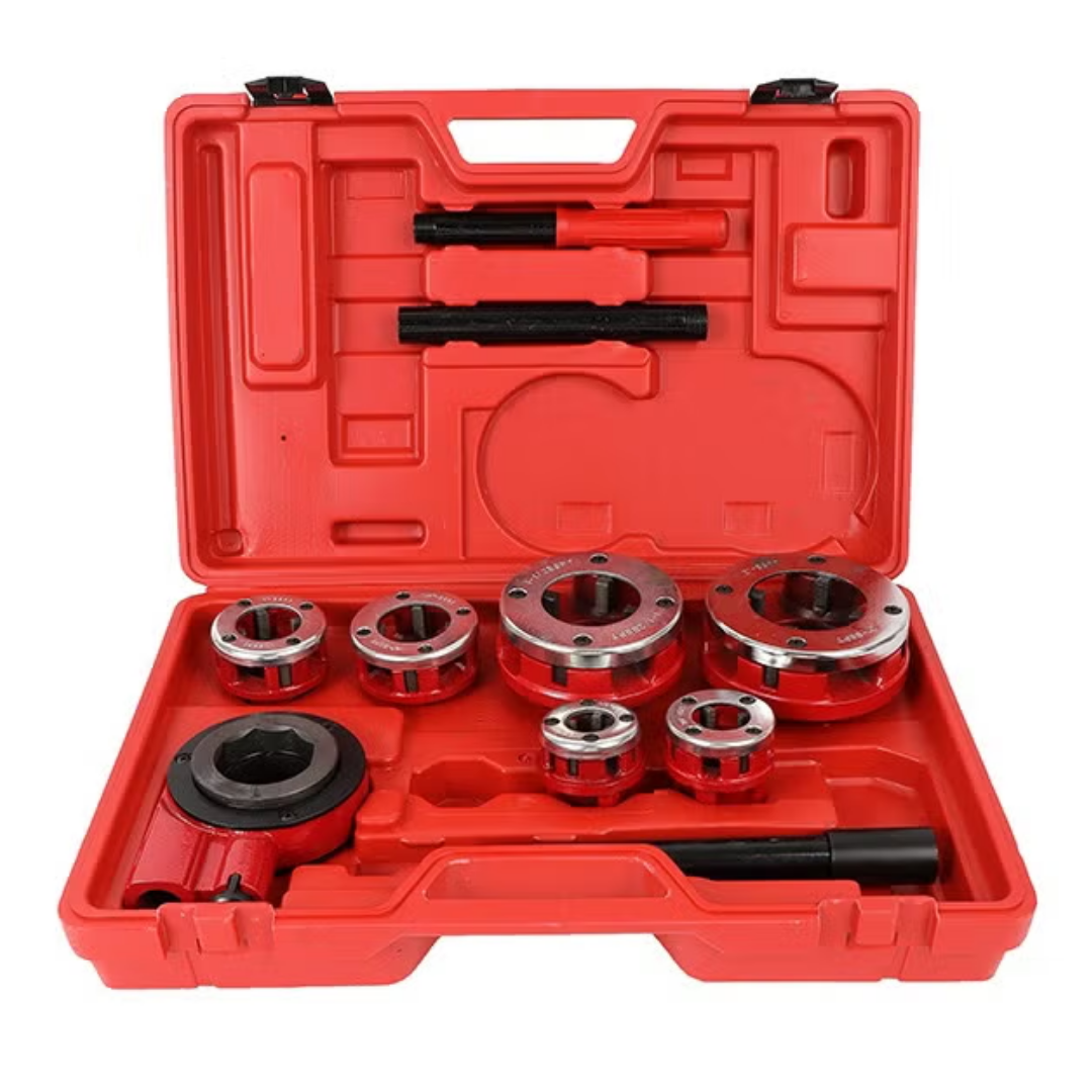 The kit includes an ergonomic handle that provides enhanced leverage and control, making it easier to thread pipes in hard-to-reach or tight spaces. The handle extends your reach and improves maneuverability in challenging working conditions. The threaded set is built to withstand frequent use and harsh environments, ensuring long-term reliability.