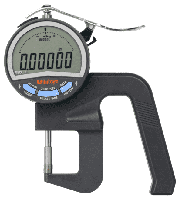 Thickness Gage Series 547 Flat Anvil Type - Digital Type. The Thickness Gages offer a quick and efficient means of inspection with their convenient grip handle, thumb trigger and spring-loaded spindle.