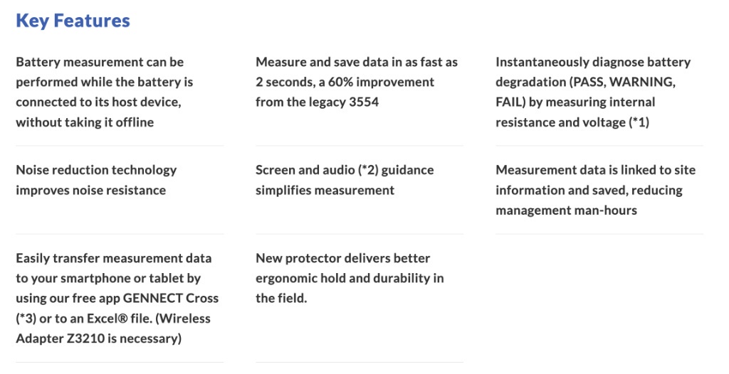 Hioki portable battery testers support the maintenance of UPS and storage batteries critical to the life support of all businesses. The BT3554-50 battery internal resistance tester sets the standard for assessing the deterioration and remaining life of UPS and other lead-acid batteries by giving a complete diagnosis via battery resistance testing. The specially designed L2020 Pin Type Lead further improves testing efficiency with an L-shaped tip that lets you reach deep into the battery racks to completely probe the terminals.