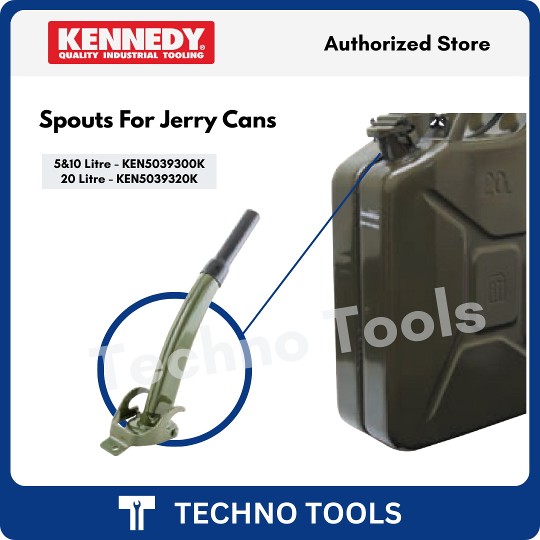 KEN5039300K The Kennedy flexible fuel pouring spout makes refueling easier and reduces spillage. Clips securely on the Kennedy jerry can. For use with the Kennedy 5Litre jerry can (KEN5039250K) and 10Litre jerry can (KEN5039260K)
