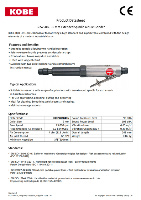 For extra reach in 'hard to get at' areas, extended spindle housing allowing two-handed operation, rear exhaust, safety lever throttle, 1/4" NPT air inlet thread for 10mm air hose, 90PSI air pressure, 4CFM* air consumption and an overall length of 248mm.