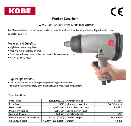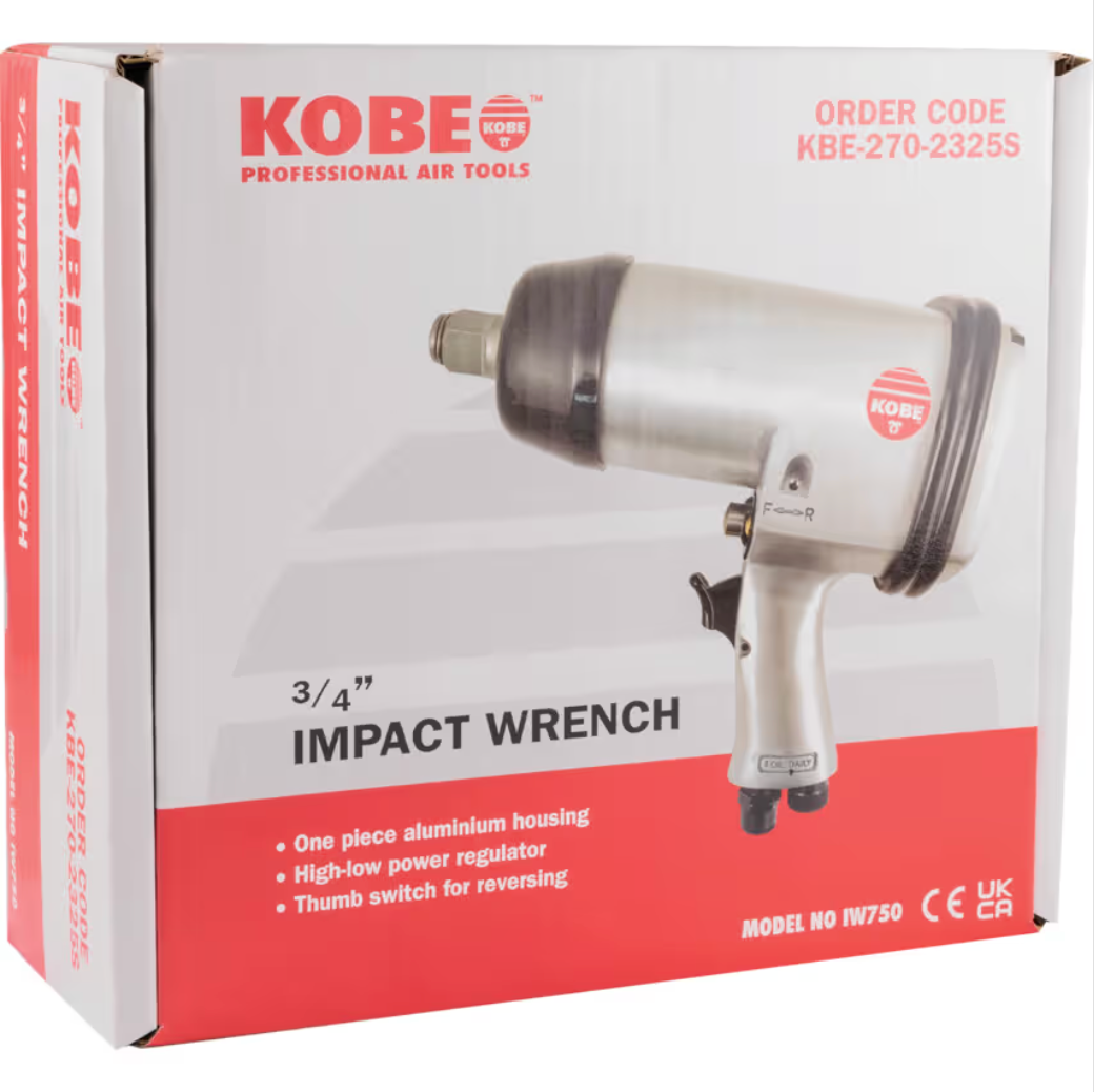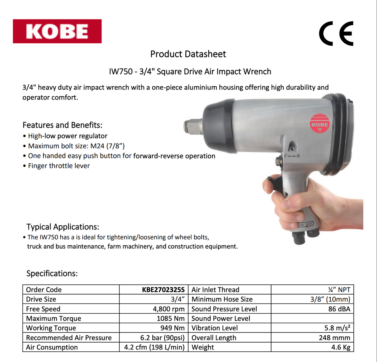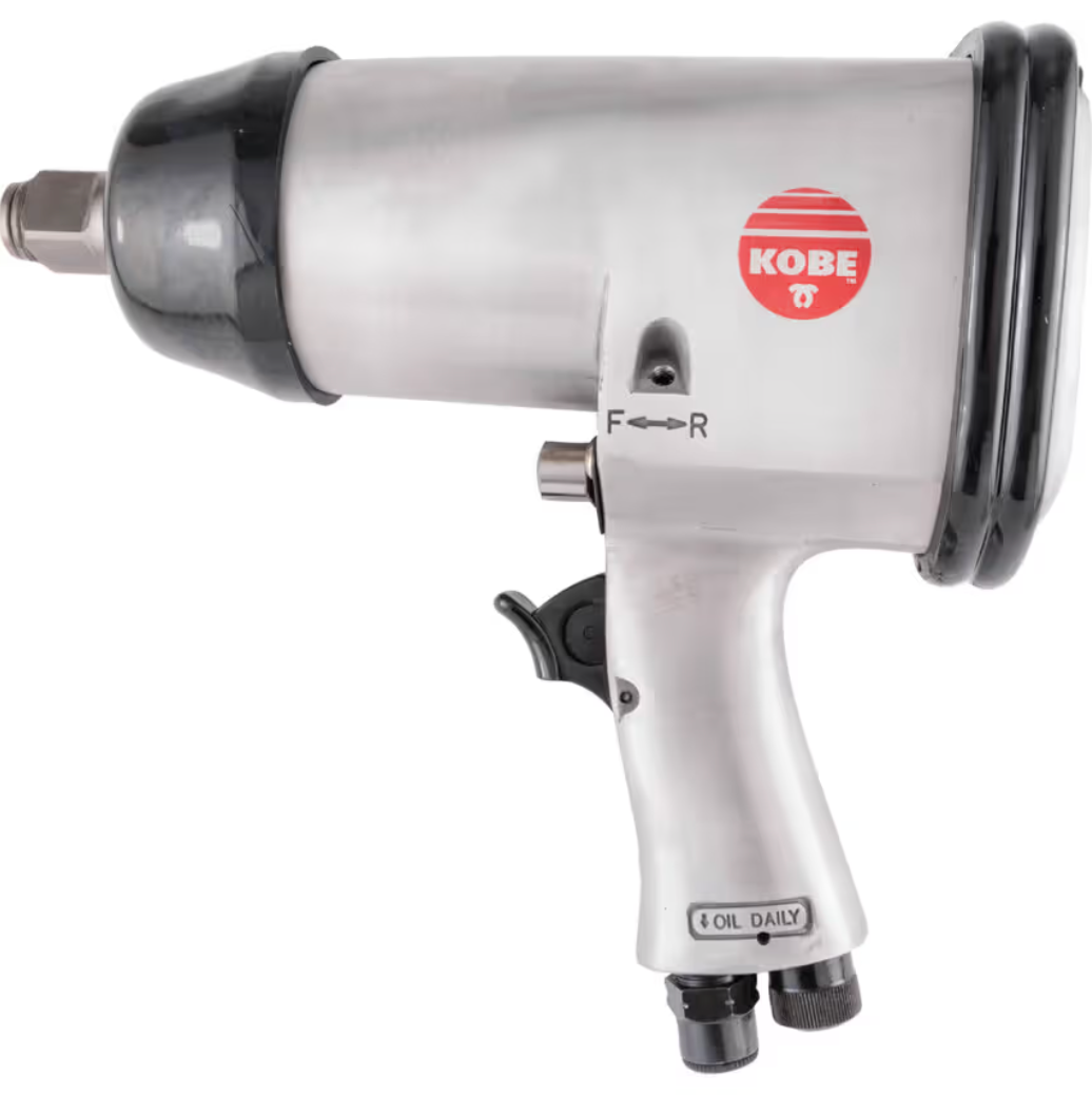 Experience professional-grade power and durability with the Kobe Red Line IW750, a high-performance 3/4" drive Air Impact Wrench. Designed for demanding applications, this wrench delivers a maximum torque of 1085Nm, making it perfectly suited for heavy-duty tasks such as maintaining trucks, buses, farm machinery, and construction equipment. The unit features a robust, one-piece aluminum housing that ensures reliability and longevity in tough workshop environments. With a 10-position power regulator and a simple thumb switch for reversing, the Kobe Red Line IW750 allows for precise control over torque output and rotation direction, accommodating a wide range of bolt sizes up to M24. Operating effectively at 90psi, this impact wrench is an essential tool for any professional mechanic or dedicated DIY user tackling serious fastening jobs.