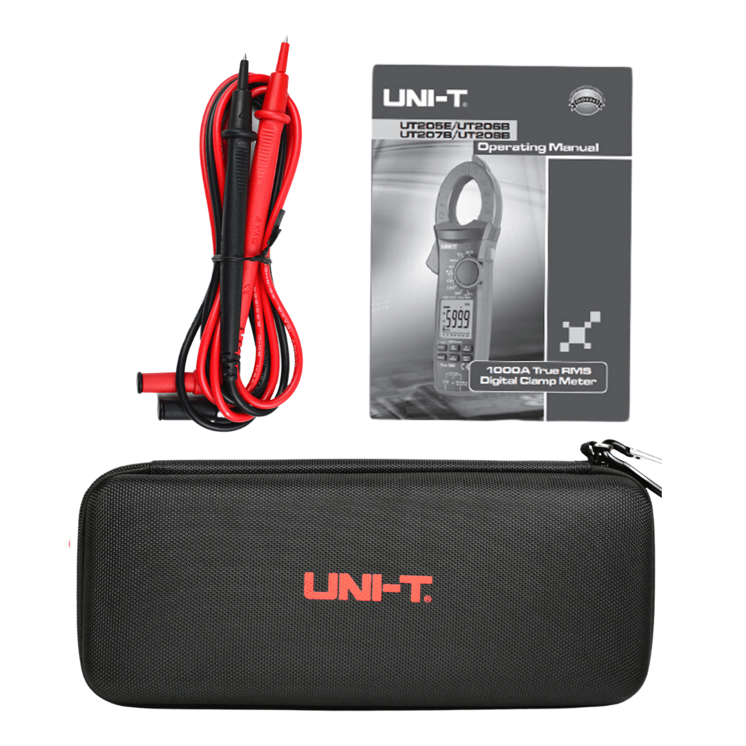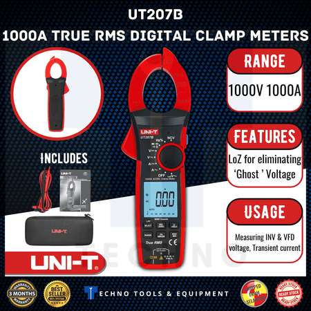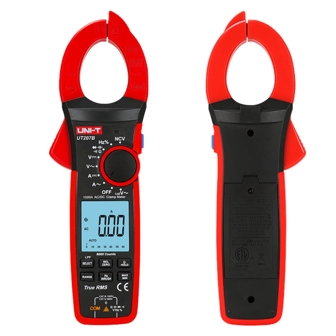 The UT207B has 6000-count digital clamp meter with auto range, large LCD, true RMS, auto-scale memory, and NCV functions. They conform to CAT III 1000V/CAT IV 600V safety rating andcertified by CE/ETL. The UT207B comes with LoZ mode for eliminating ‘ghost’ voltage, LPF ACV function for measuring INV and VFD voltage, and inrush current mode for capturing transient current.